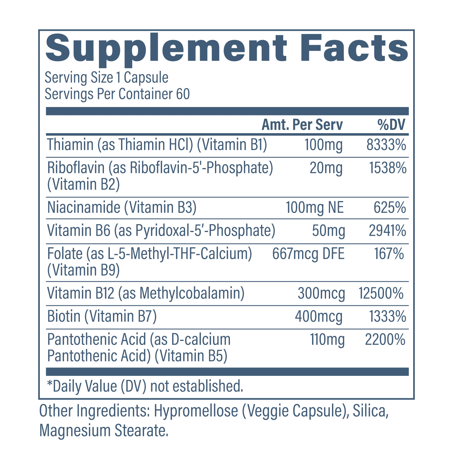 Our all-natural B-Complex is designed to support cell growth, promote healthy skin, and aid in energy production, while also supporting the immune system. Each capsule is packed with essential B-vitamins that work together to help you feel your best.*