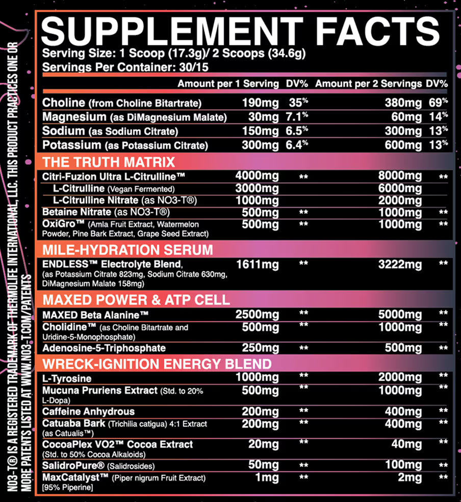 · 8g Citrulline w/ 2g Citrulline Nitrate (NO3-T®) → fuels endogenous arginine → NO synthase AND nitrate → nitrite → NO conversion.