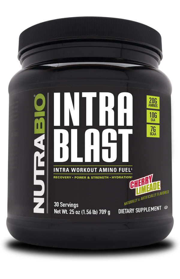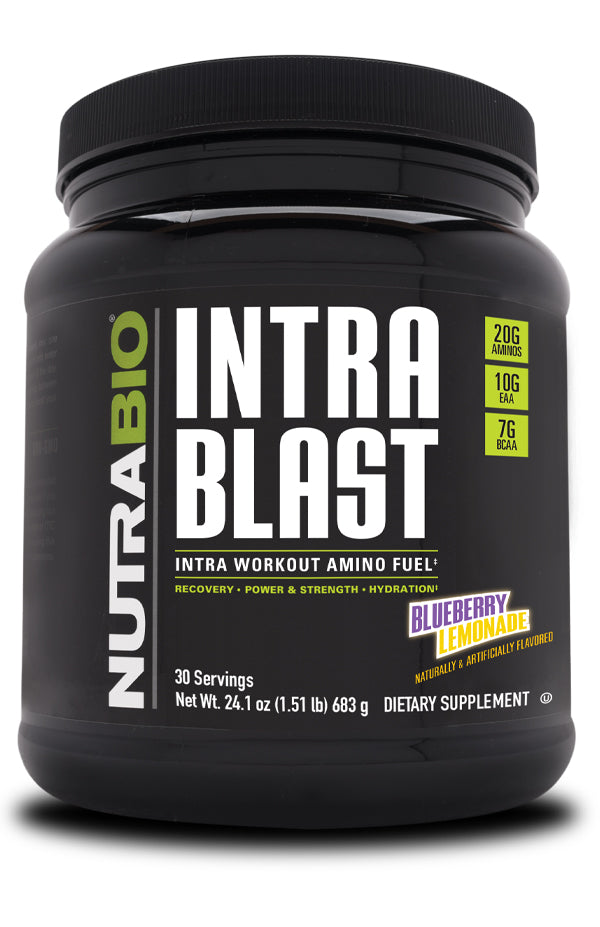 NutraBio Intra Blast is an essential amino acid (EAA) powerhouse that was developed to address the time between pre- and post-workout, commonly referred to as the intra-workout period, when critical nutrients are needed to fuel performance, blunt fatigue, and accelerate recovery. Unlike other intra workouts that contain only branched chain amino acids (BCAAs), Intra Blast contains over 10,000 mg of all 9 essential amino acids, including BCAAs, clinically dosed to work synergistically in order to stimulate muscle protein synthesis, promote muscle growth, enhance recovery, and decrease muscle soreness from the most intense training sessions. NutraBio took Intra Blast's formula one step further by adding other ingredients, such as glutamine and betaine, that have been scientifically proven to accelerate recovery, replenish energy stores, improve strength, and keep you hydrated during your workouts. Intra Blast is without question the most advanced intra-workout amino acid product ever created. Take a look at the label and you will find each scoop of Intra Blast contains: