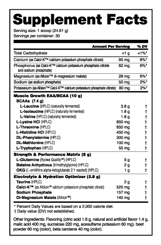 - 2805 mg of six EAAs to support muscle protein synthesis and other vital physiological functions in the body