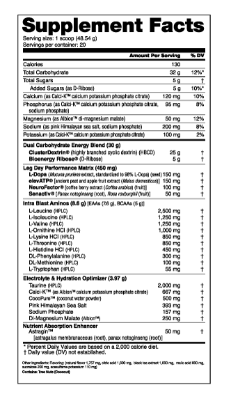 LEG DAY includes a comprehensive array of essential electrolytes as well as a full 1,000mg of Taurine -- an amino acid that functions as an osmolyte, which encourages muscle cells to absorb more fluid, increasing muscle fullness and hydration while combating the onset of fatigue.*
