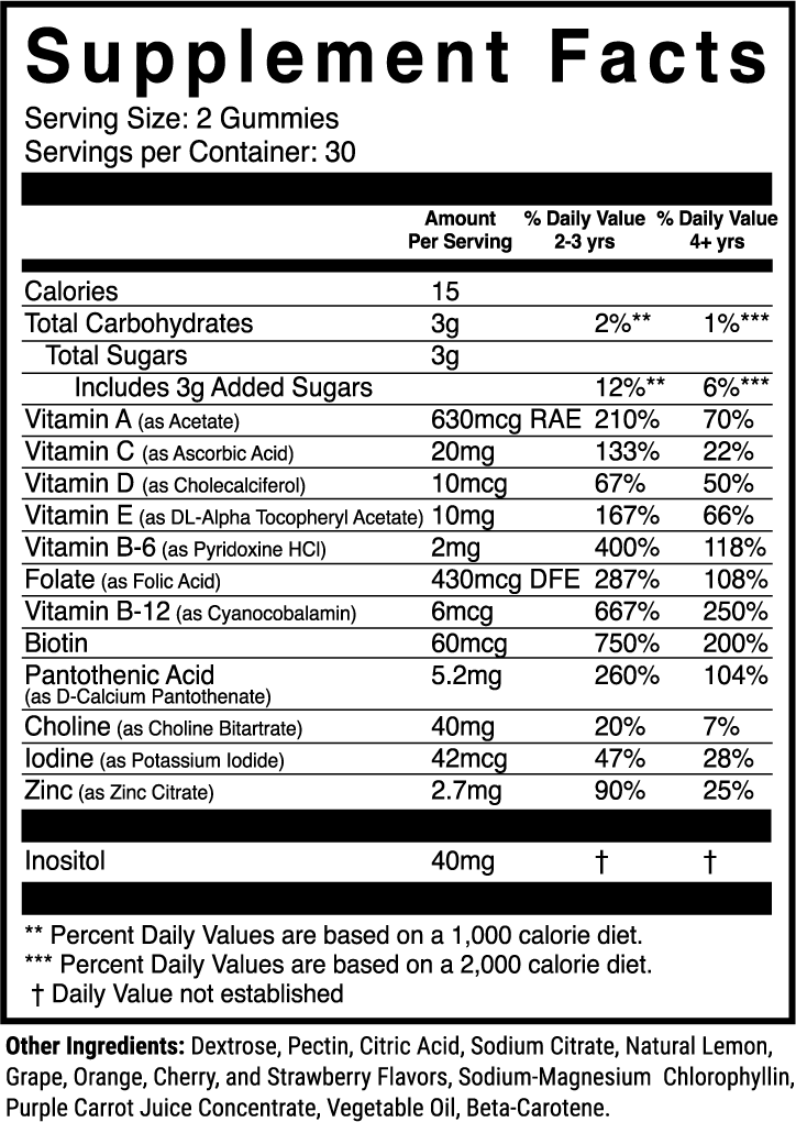 - Support their vision and healthy hair, skin, & nail growth with vitamins A, C, D, E, Biotin, & Zinc