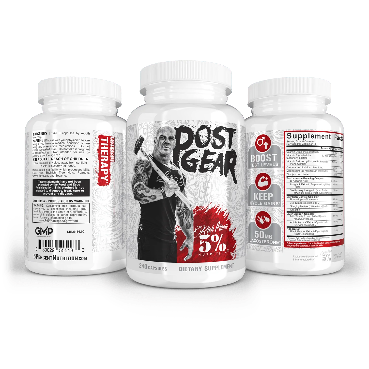 Where can you get a complete PCT formula that covers all of these requirements? There's no other choice than Post Gear by Rich Piana 5% Nutrition! No one knows hardcore better than 5%! Post Gear has everything you need for the most effective post cycle therapy program possible - testosterone support, estrogen inhibitors, liver support, and cortisol regulation. That means you stay healthy and bring your hormones back into balance so you can keep your gains!