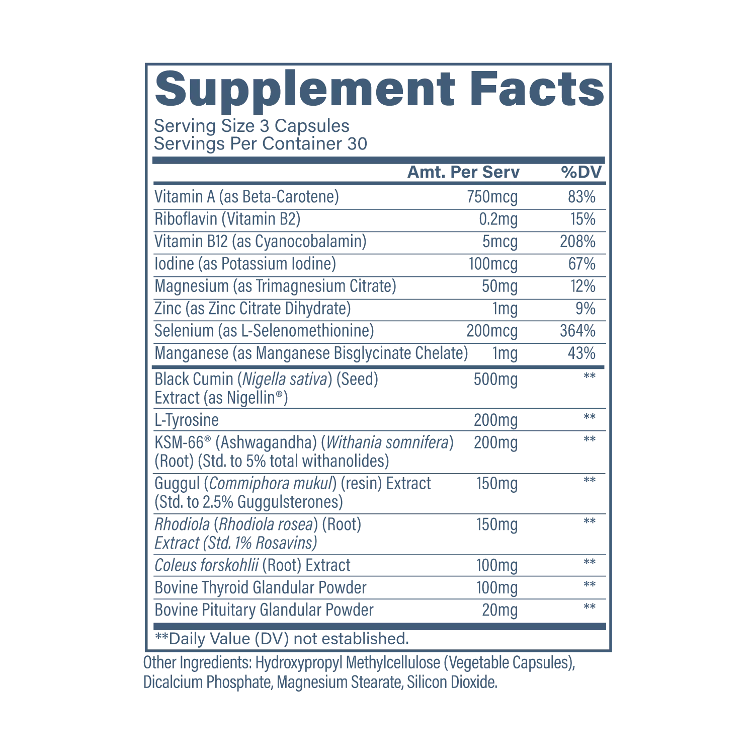 This supplement contains a blend of essential vitamins and minerals, including iodine, zinc, and selenium, which are all important for thyroid health. It also includes a potent blend of herbs, including ashwagandha, bladderwrack, and schisandra, which have been traditionally used to support thyroid function.*