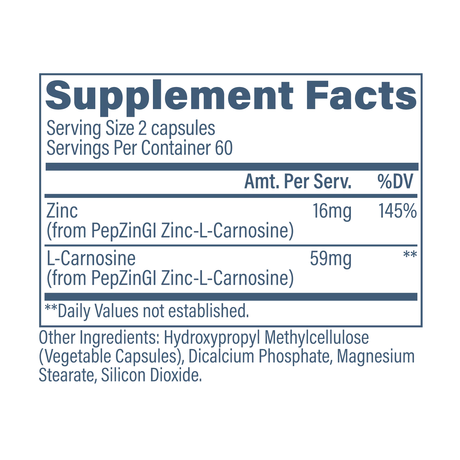 Revive Zinc Carnosine provides a unique combination of zinc and carnosine to support your digestive health. Zinc is an essential mineral that plays a vital role in various bodily functions, including immune system support, cell growth, and wound healing. Carnosine, a dipeptide made up of the amino acids beta-alanine and histidine, is known for its ability to support healthy gut function and help protect against oxidative stress.*